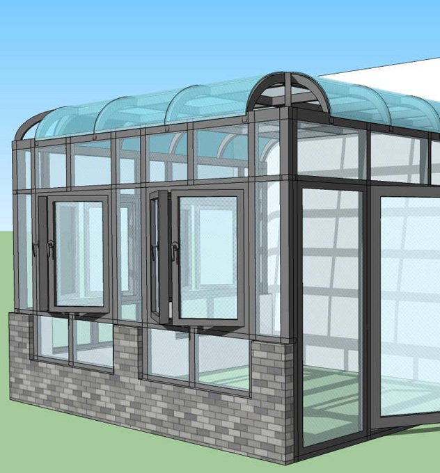 1..整体材料采用了铝合金结构组合而成,材质轻、性能好、密封性强;型材主要受力杆件厚度十足,可内套镀锌钢,具有较强的牢固性及承重能力,可做大跨度,大宽度无立面阳光房。