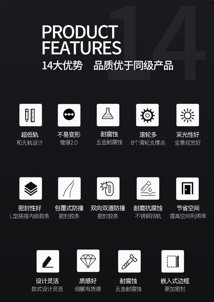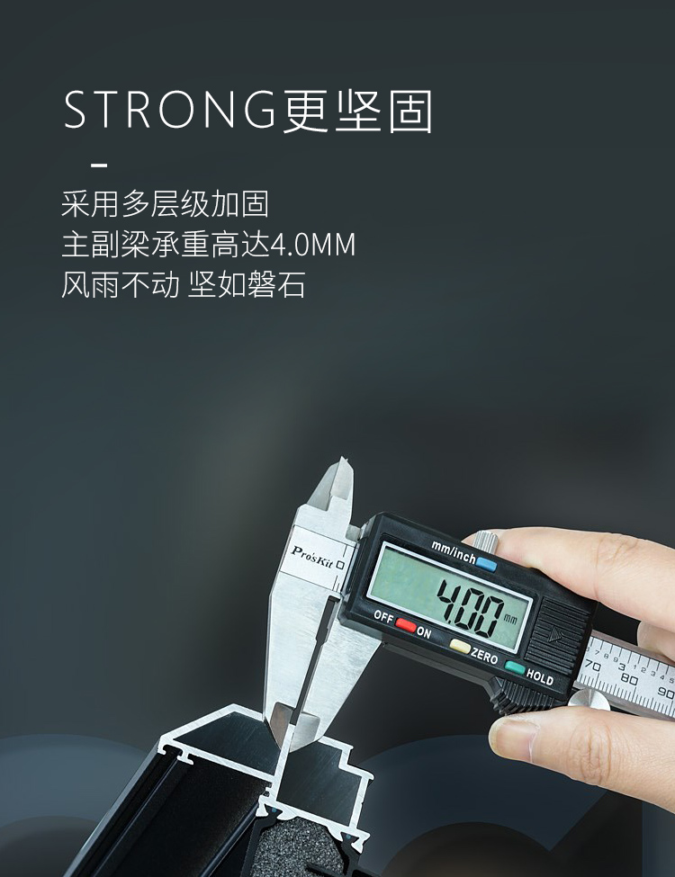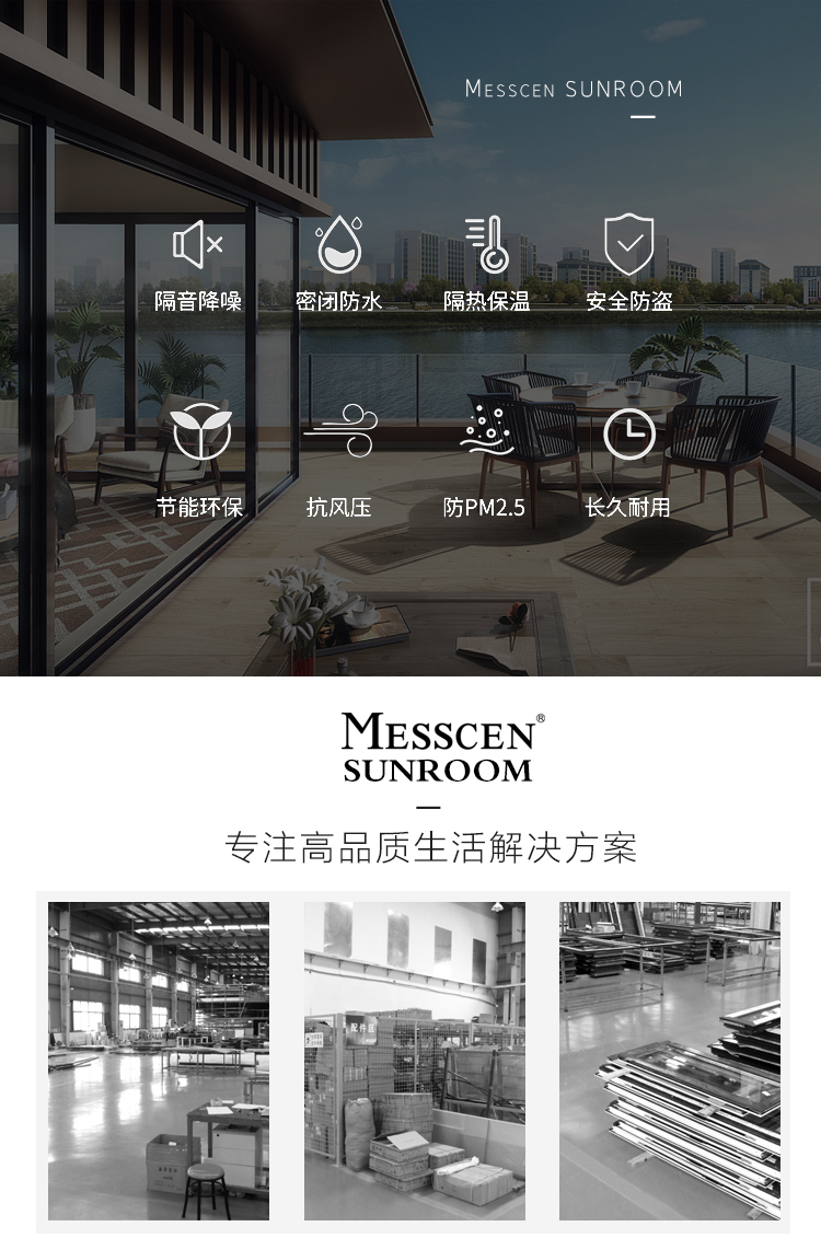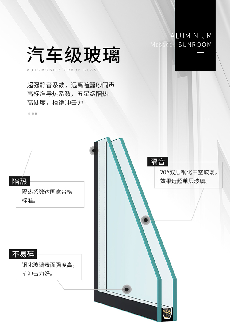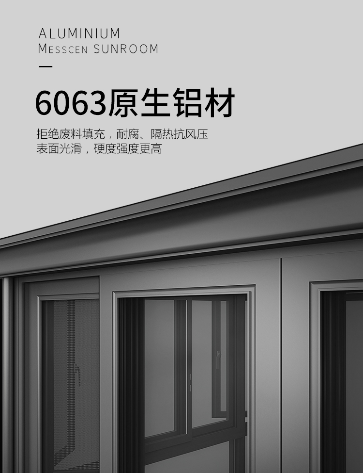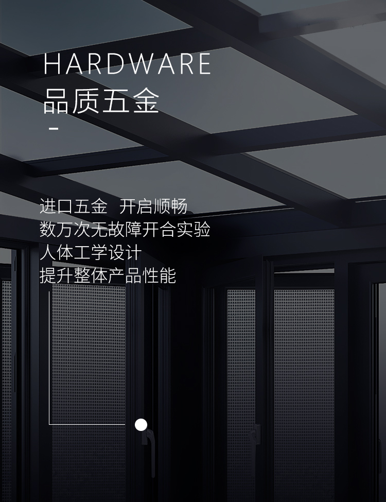 1..整体材料采用了铝合金结构组合而成,材质轻、性能好、密封性强;型材主要受力杆件厚度十足,可内套镀锌钢,具有较强的牢固性及承重能力,可做大跨度,大宽度无立面阳光房。
